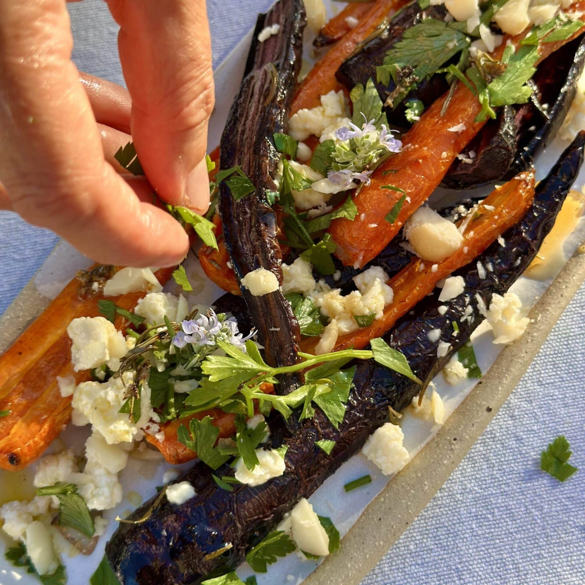 We love simple food. Honey-glazed carrots with feta, macadamias, parsley and rosemary from Jess’s garden.