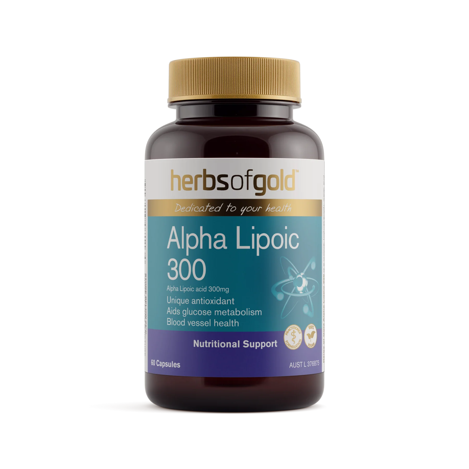 Herbs of Gold Alpha Lipoic 300 contains high-strength alpha Lipoic acid, an antioxidant that reduces free radicals formed in the body.