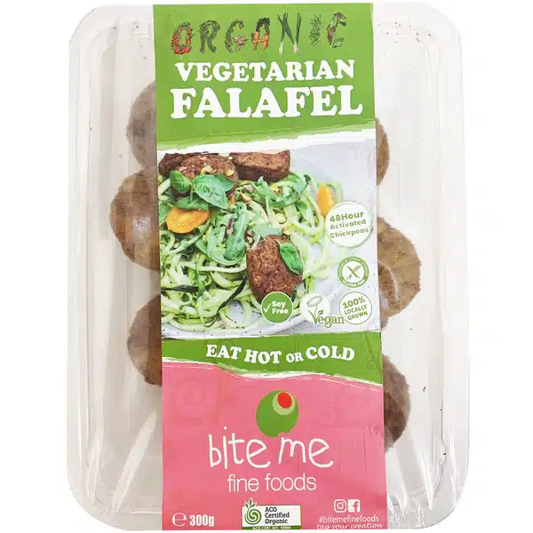 Bite Me Organic Falafel Bites are a classic Middle Eastern–inspired food, prepared using certified organic ingredients and Australian-grown produce. Made with organic chickpeas as the base, these falafel bites are blended with fresh herbs and spices to create a balanced, savoury flavour and a firm, satisfying texture.