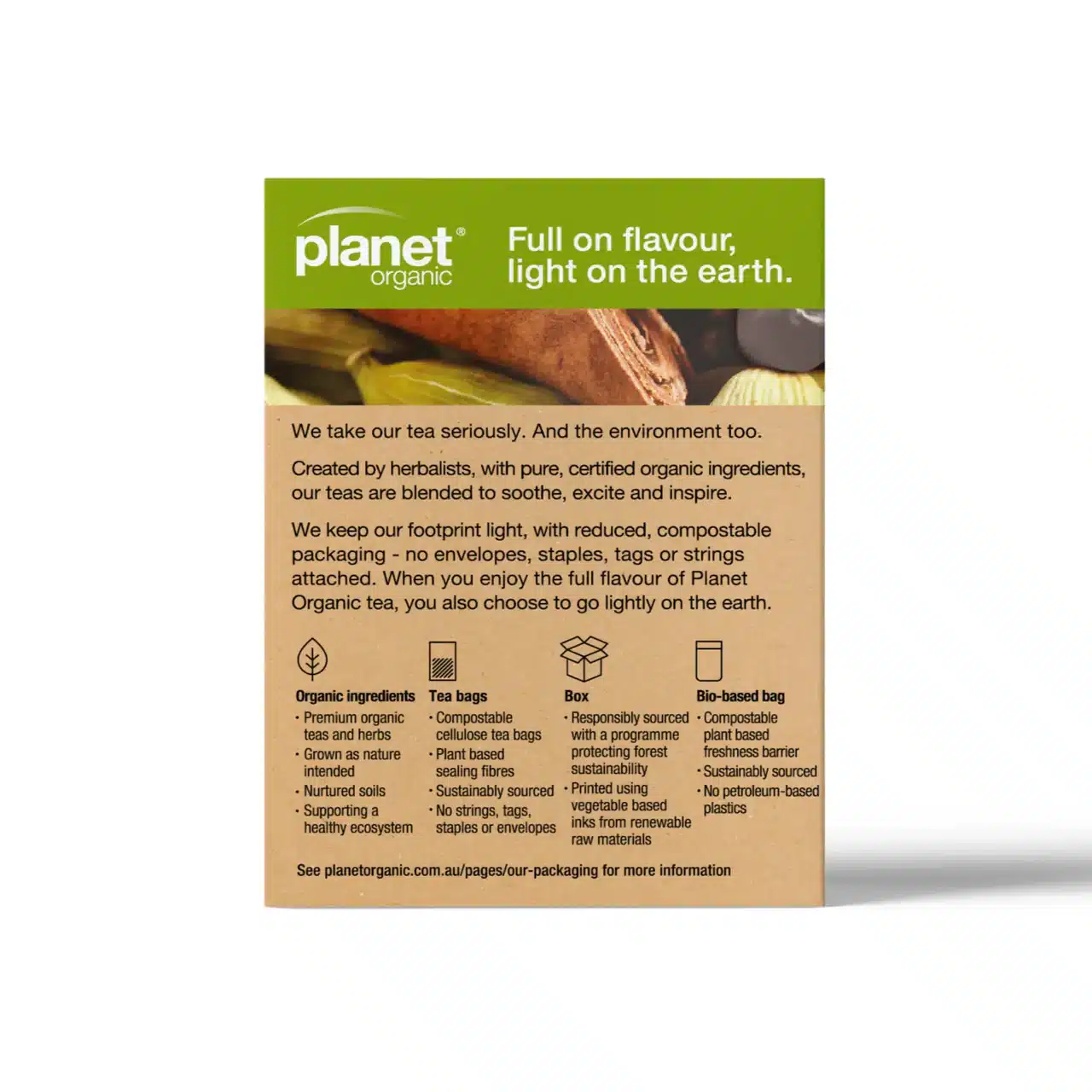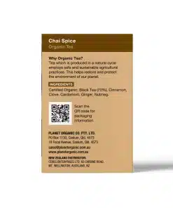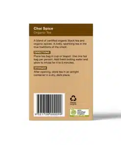 A warming organic chai blend with black tea, cinnamon, clove, cardamom, ginger and nutmeg. Aromatic, comforting and perfect with or without milk.
