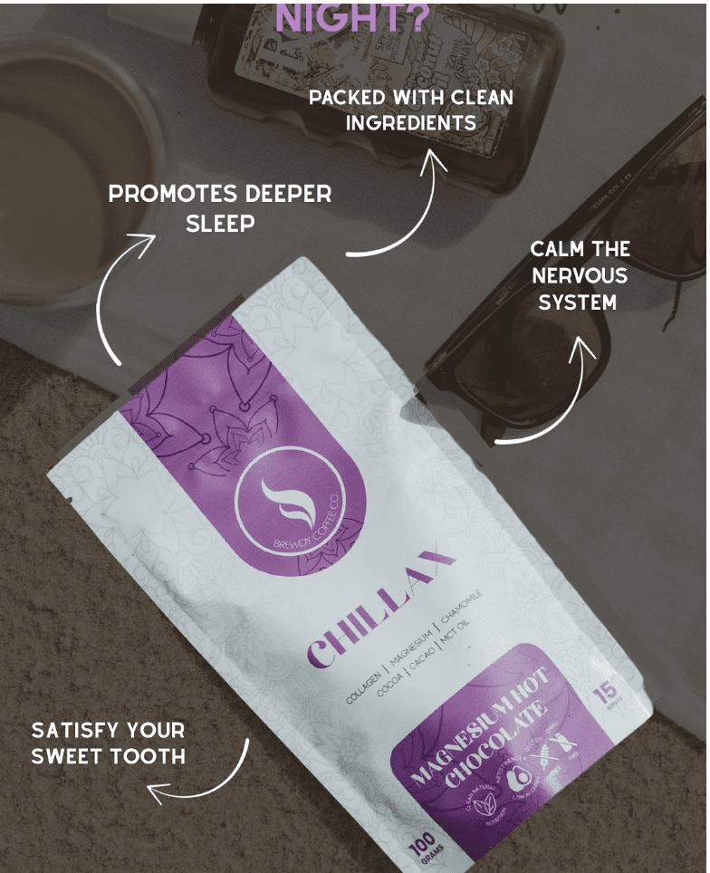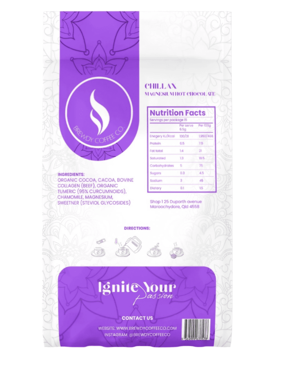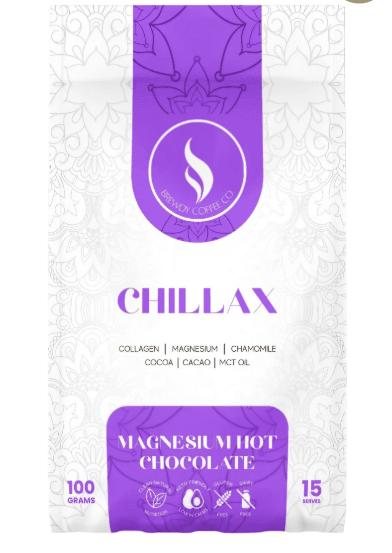 Chillax Hot Chocolate by Brewdy Coffee Co. is a rich, soothing blend crafted for moments of calm. Made with organic cocoa and cacao, marine-grade magnesium, chamomile and collagen peptides, it delivers a deeply comforting cup designed to help you unwind at the end of the day. Smooth, velvety and gently sweetened with organic stevia, it’s your evening ritual in a mug.