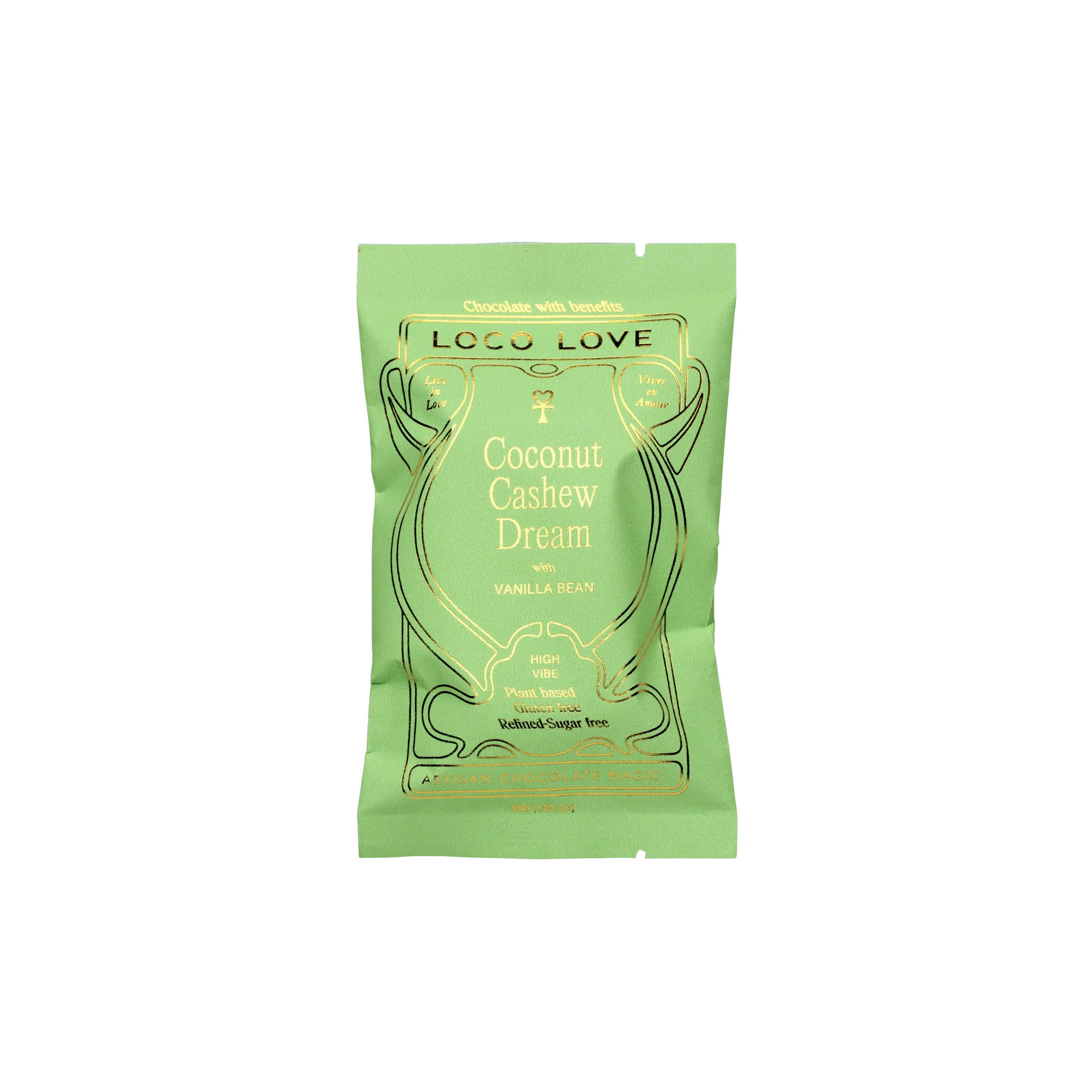 A coco-nutty caramel with chunks of lightly toasted cashews; slightly salted with a chewy texture and a whole lotta’ love. Delightfully enhanced with aromatic vanilla bean and enrobed in dark 70% Peruvian cacao. Take a bite and feel the magic.