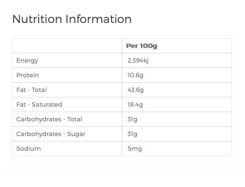 Made in Australia using pesticide-free, Australian Grown Almonds and Belgian dark chocolate.