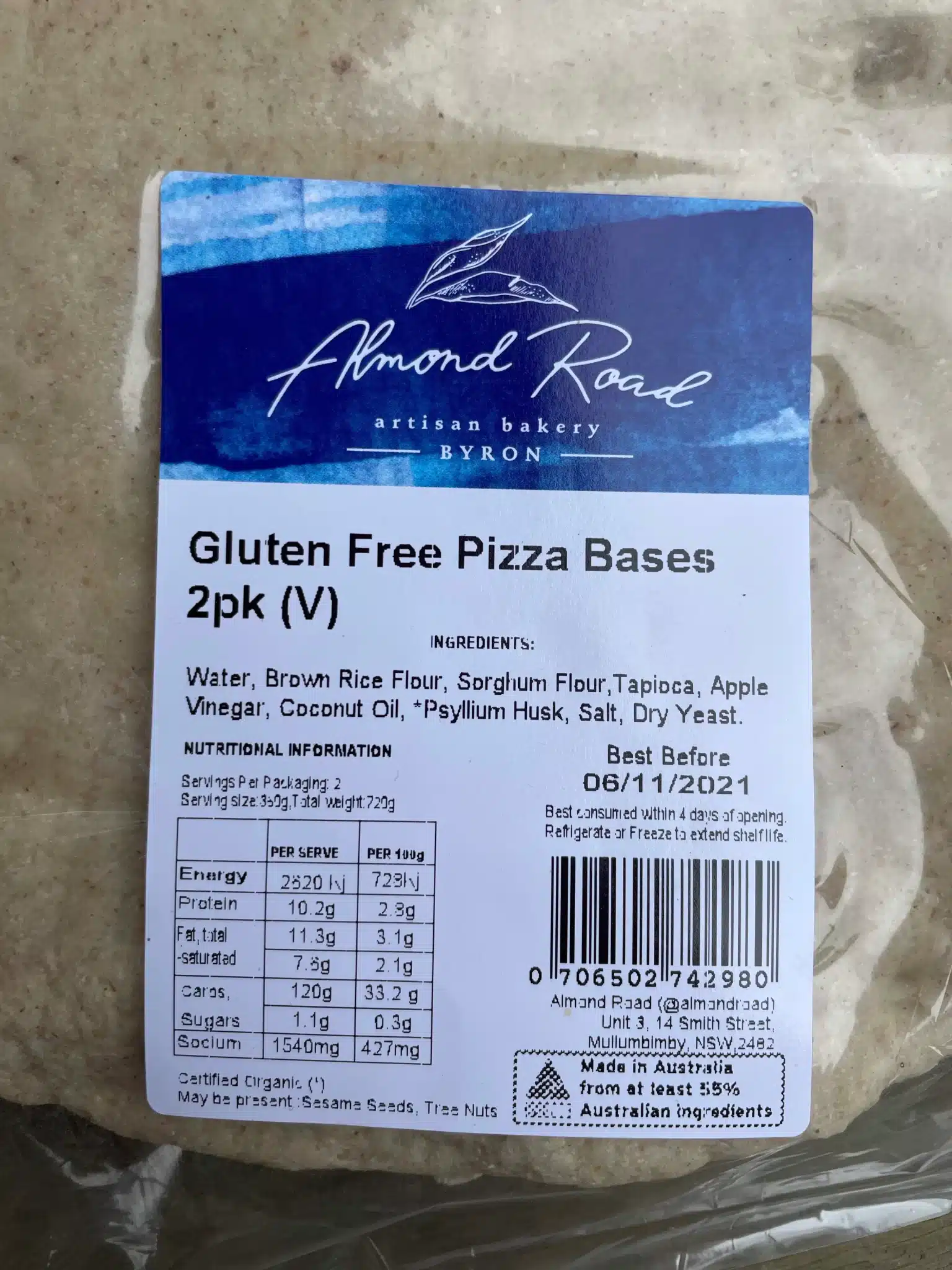 These artisan gluten-free pizza bases are crafted by Almond Road in Byron using a simple, wholesome blend of brown rice flour, sorghum flour and tapioca. Soft yet sturdy, they create the perfect canvas for your favourite toppings — from classic margherita to loaded veggie or gourmet creations. Naturally gluten free, vegan friendly and made with clean ingredients.