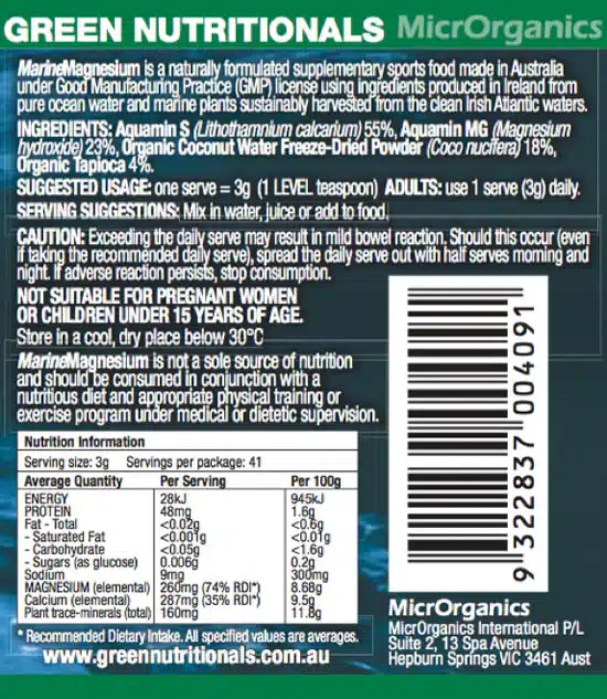 Green Nutritionals Marine Magnesium is a natural, vegan-friendly magnesium supplement sourced from pure marine plant minerals. Formulated with Aquamin S® and Aquamin Mg®—both derived from sustainably harvested sea minerals—it provides highly bioavailable magnesium along with naturally occurring trace minerals. Gentle on digestion and ideal for supporting muscle function, relaxation, energy production and overall wellbeing.