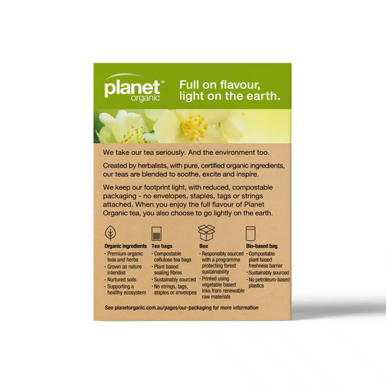 Planet Organic teabags are fully compostable, bleach free and plastic free.