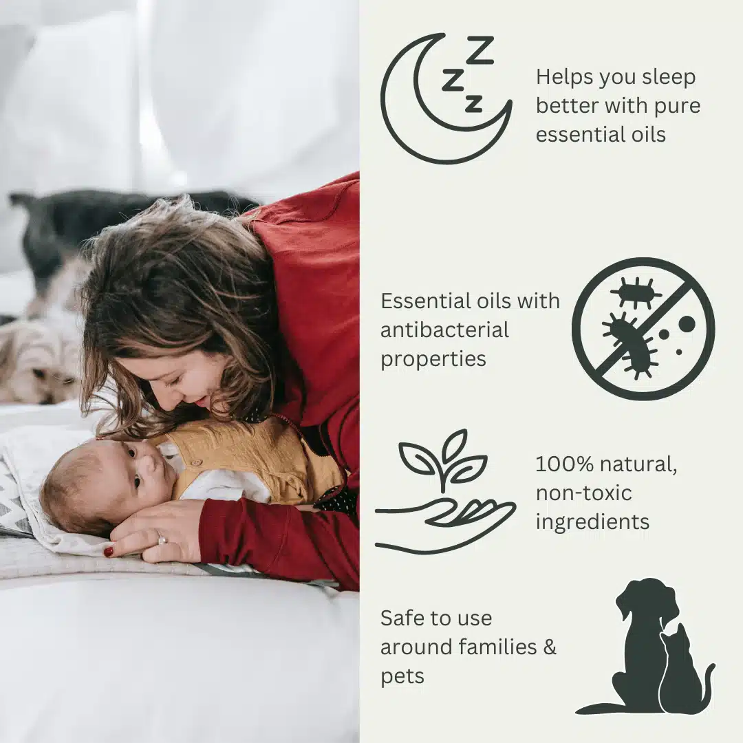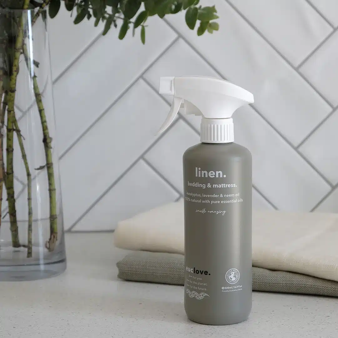 Natural linen and mattress spray with neem, eucalyptus, lavender and vetiver. Freshens fabrics, helps deter insects and supports calm, restful sleep. Plant-based, non-toxic and fast-drying.