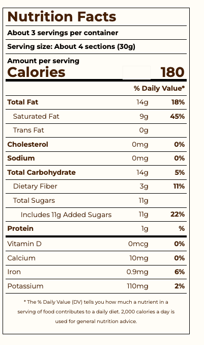 Ingredients: Organic dark chocolate (*organic cacao beans, *organic raw cane sugar, *organic cocoa butter, *organic vanilla beans), organic mint crème filling (organic coconut oil, *organic raw cane sugar, *organic cocoa butter, organic whole milk, organic peppermint oil).