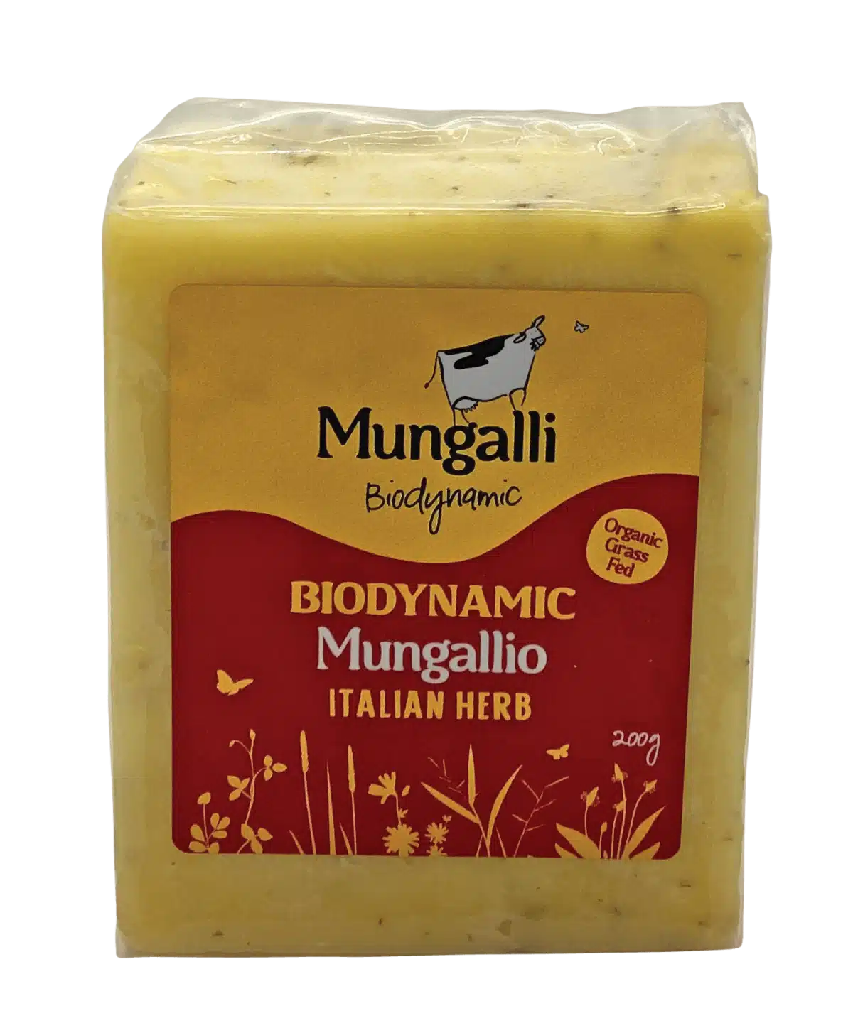 Mungallio Italian Herb Cheese 200g is a herb-infused version of Mungalli’s traditional farmhouse cheese. Crafted from biodynamic full cream cows milk, this cheese is blended with classic Italian herbs to create a savoury, aromatic flavour profile.