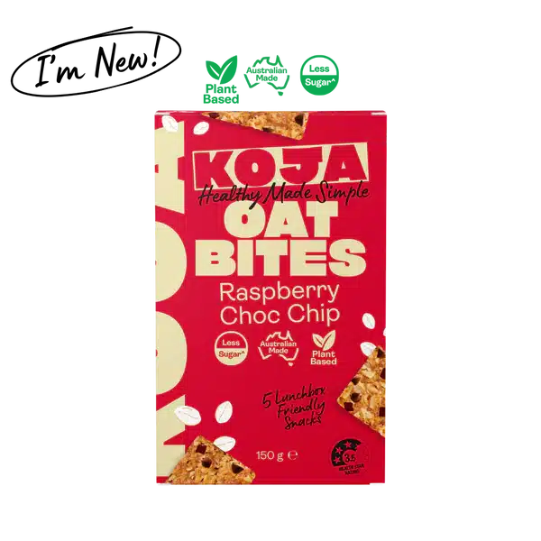 Introducing the brand new KOJA Raspberry & Choc Chip Oat Bites! Made with Australian rolled oats and real raspberry pieces, these lightly baked bites are a wholesome, high-fibre snack that’s perfect for on-the-go or as a tasty lunchbox treat.