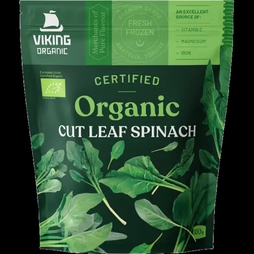Viking Organic Leaf Spinach is a frozen vegetable made from 100% organic spinach leaves. It offers a practical way to keep leafy greens on hand, ready to use across a wide range of everyday meals without the need for washing or trimming.