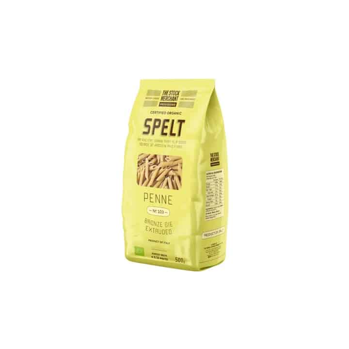 The Stock Merchant Organic Spelt Penne Pasta is a simple, well-made organic pasta crafted from organic spelt wheat flour. Shaped into classic penne tubes, it is designed to capture sauces both inside and out, making it a dependable option for a wide range of everyday meals.