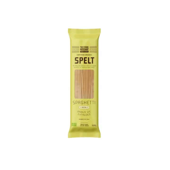 The Stock Merchant Organic Spelt Spaghetti Pasta is a traditional style organic pasta made using organic spelt wheat flour. Formed into long, fine strands, it is suited to classic pasta dishes where a smooth, even coating of sauce is desired.
