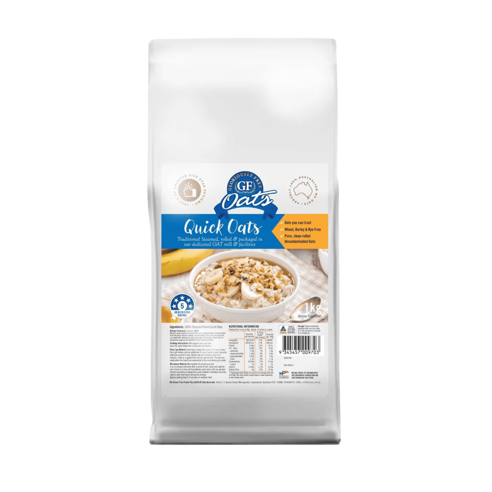 Quick oats or Instant oats are a favourite choice for the time-conscious as they are quicker to cook. They are also easier to chew and digest than whole oats, the perfect choice for a quick porridge, smoothies, or overnight oats. Whatever your reason for choosing Quick Oats, you will love that GF Quick Oats don’t compromise on the delicious taste and flavour of oats that you know and love. Grown in the beautiful farming area of Wandering in Western Australia, light, fluffy, creamy steamed rolled oats.