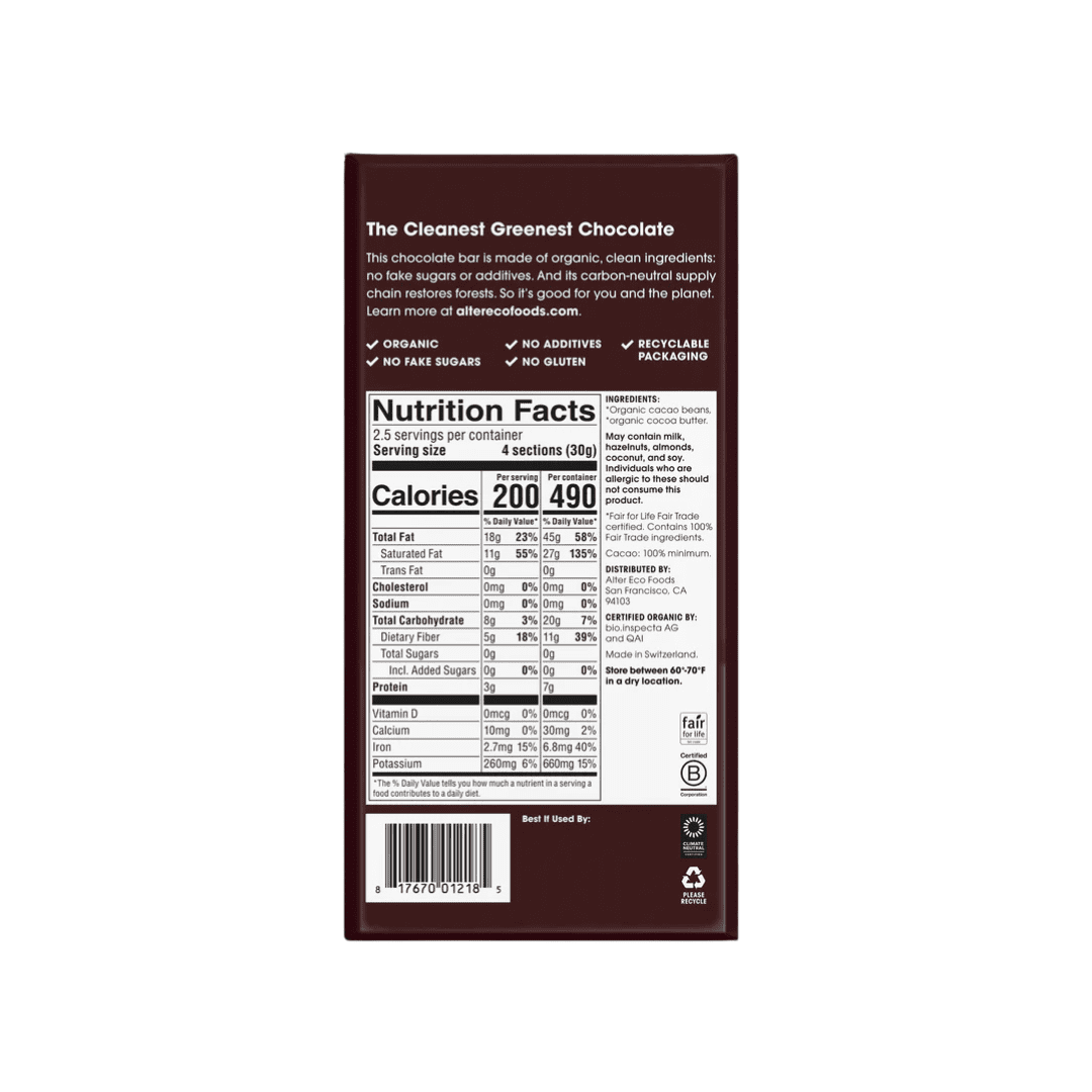 This 100% cacao bar is as pure as chocolate gets. Just 2 ingredients: organic cocoa beans plus organic cocoa butter. No sugar added.